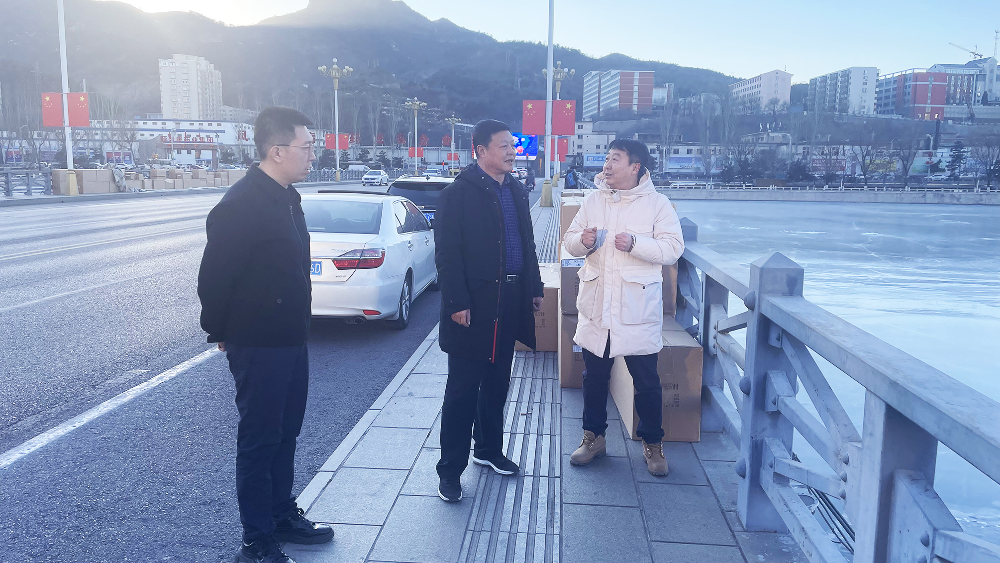 在府前路大橋施工現(xiàn)場(chǎng),徐俊儒總經(jīng)理聽取了施工單位關(guān)于亮化工程的施工進(jìn)展及疫情防控情況介紹,了解了設(shè)備安裝和材料采購(gòu)運(yùn)輸情況,查看了工程施工進(jìn)展及相關(guān)安全防護(hù)措施。