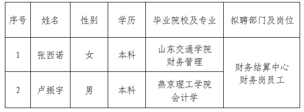 依據出資人代表機構審批意見,承德市國控投資集團有限責任公司委托第三方機構面向社會公開招聘財務崗員工2人?,F對擬錄用人員信息進行公示,公示期間如有異議,可通過電話、信函等方式反映,反映意見請署真實姓名。