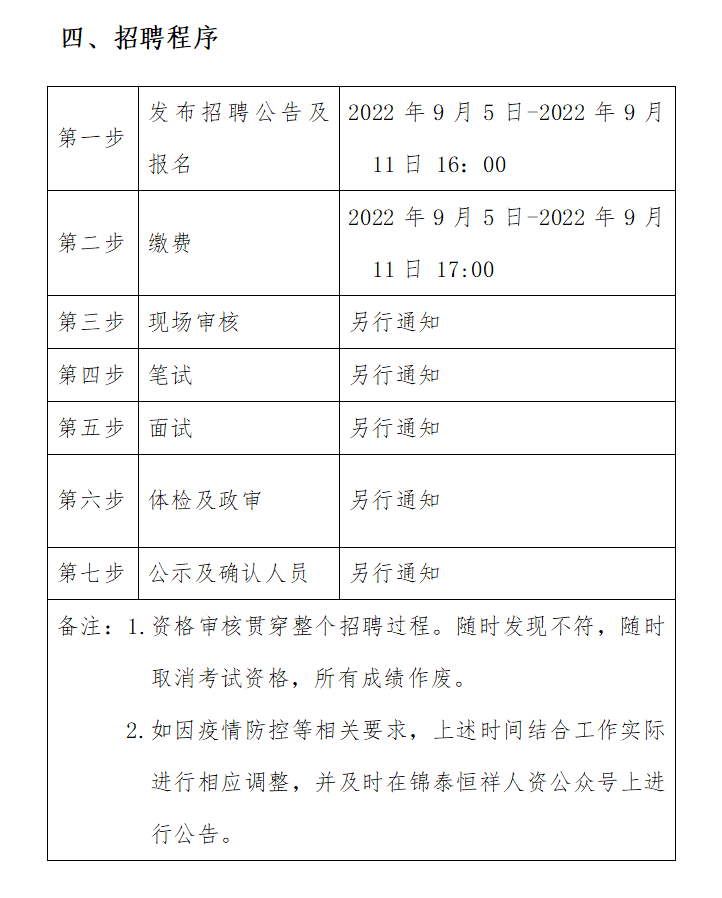 ?2022年9月5日-2022年9月11日16:00 在錦泰恒祥人資官網(wǎng)(www.jthxhr.com)、“錦泰恒祥人力資源服務(wù)有限公司”微信公眾號(hào)、“國(guó)控集團(tuán)”官方網(wǎng)站(m.leishijy.com)及上級(jí)部門要求的相關(guān)網(wǎng)站等發(fā)布招聘公告。